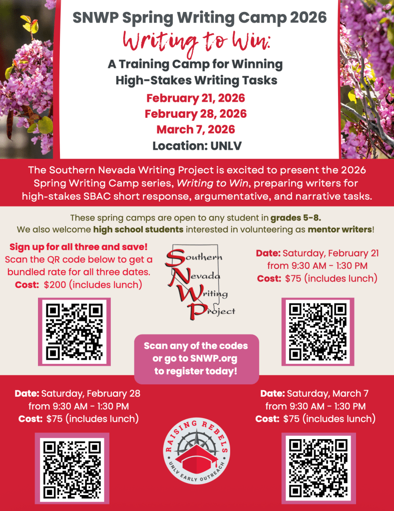The Southern Nevada Writing Project is excited to announce our 2026 Spring Writing Camp series: Writing to Win—A Training Camp for Winning High-Stakes Writing Tasks. This three-part workshop is designed for students in grades 5–8 who are preparing to take the SBAC Performance Tasks this spring.